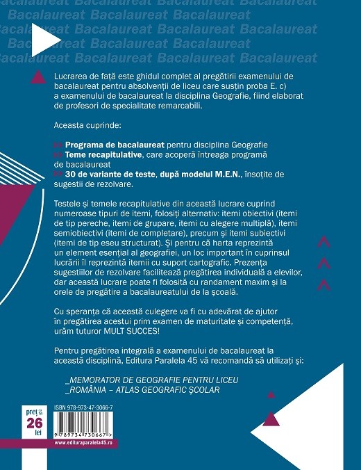 Ghid de pregatire pentru examenului de bacalaureat. Probleme fundamentale se adreseaza deopotriva mai multor categorii de persoane: In primul rand, elevilor, indeosebi celor de clasa a xii. Bac geografie 2012 caiet pregatire profudegeogra.eu2 Cartea geografie.ghid de pregatire pentru bac a fost scrisă de catalina sandulache și a apărut în anul 2017 la editura universitara. Cartea are 219 de pagini și se încadrează în categoria culegeri auxiliare. Ghid de pregatire pentru examenului de bacalaureat.